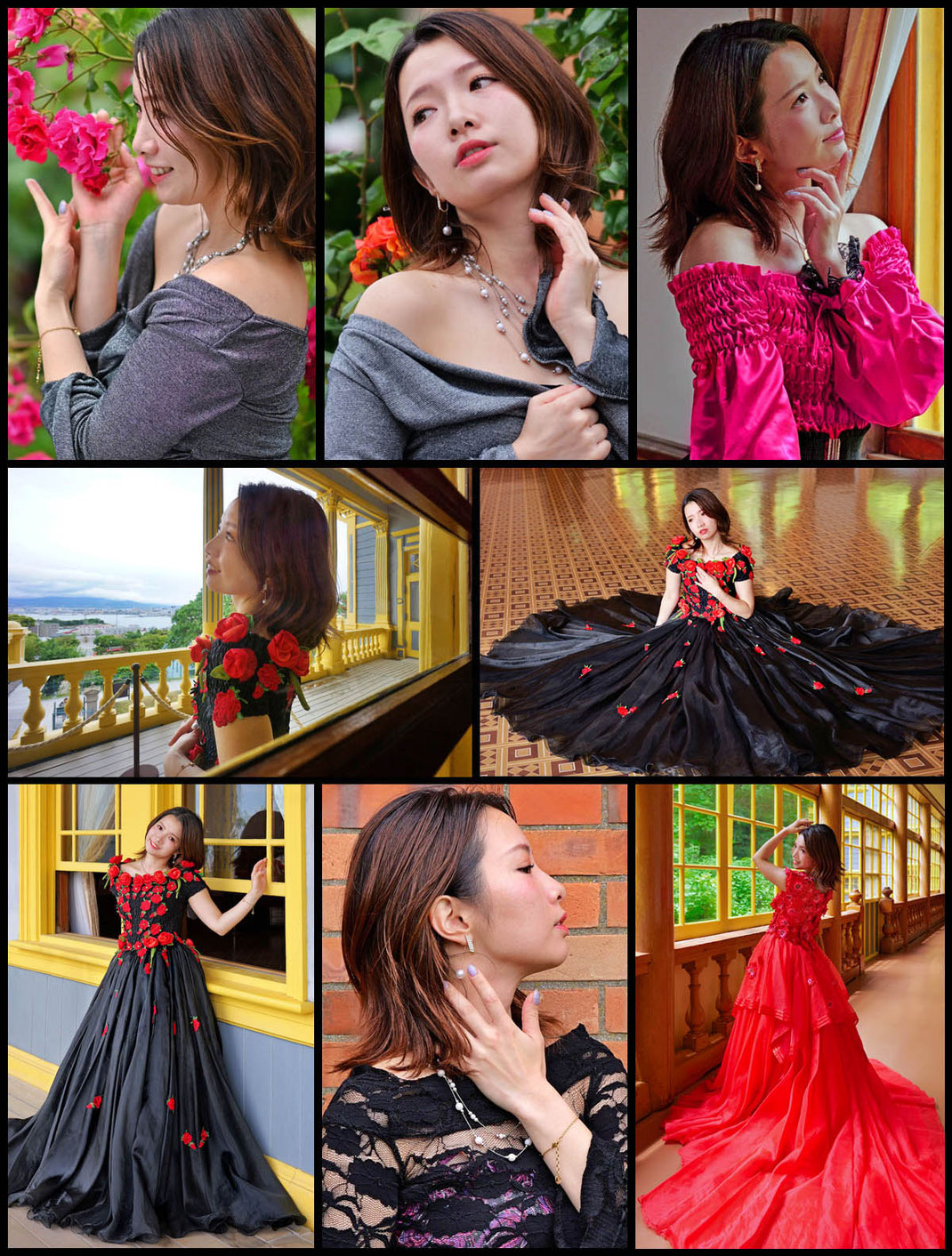ペンションを出発する時に着て行った衣装で1時間近く撮影し、次にハイカラ衣装館の真っ赤なドレスで撮影。衣装代は30分2,500円です。2着目は少し割引きになり30分で2,000円。黒にバラのドレスです。モデル撮影会としては30分はやや短い感じもしますが、一般のお客さんに迷惑をかけることもなく、南側の廊下にバルコニー、そして床にしゃがんで撮影することができました。